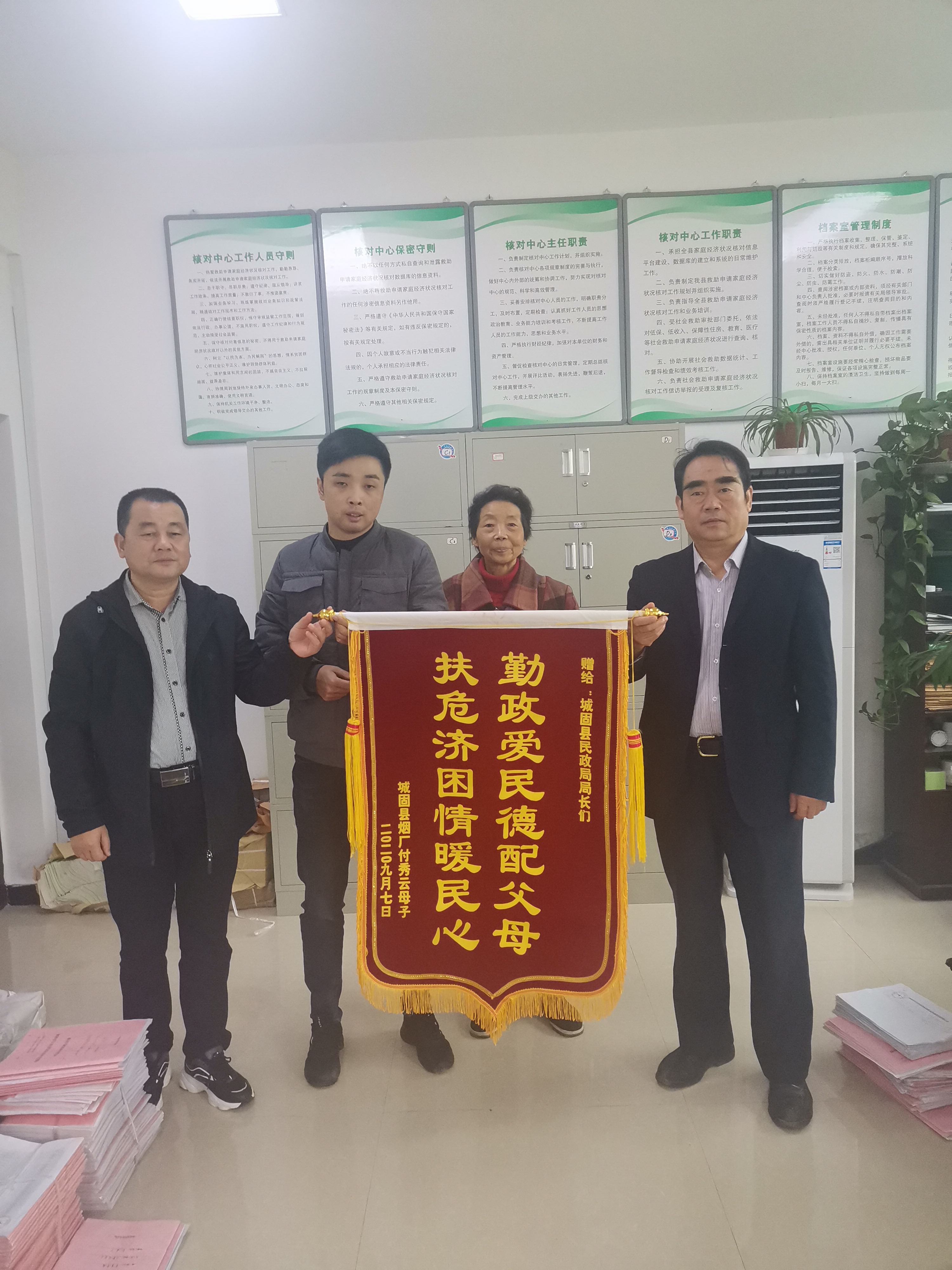 10月16日上午,城固县博望街道办西关街社区低保户付秀云来到县民政局,将一面绣有“勤政为民德配父母,扶危济困情暖民心”的锦旗送到民政局党组成员手中,感谢民政局领导干部对她的关心和照顾。
