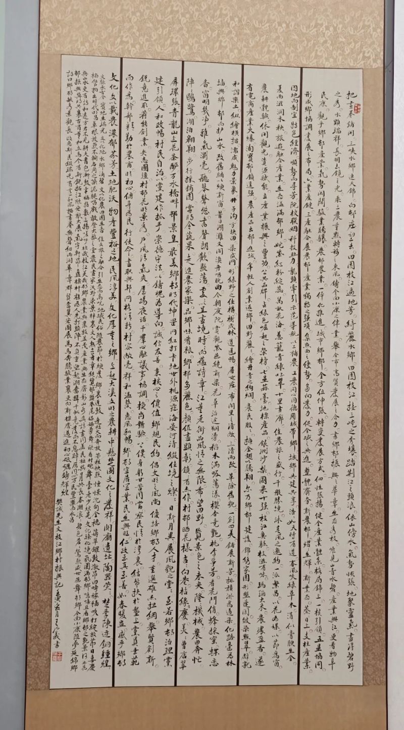 在展厅的显著位置,一幅气势磅礴的书法作品——《枝江乡村振兴记》吸引了记者的目光。陈国才现场介绍,这是老书协副会长樊诚历时四个月时间,搜集资料、了解情况,精心创作的作品,主要描绘了近年来枝江乡村振兴建设天翻地覆的变化,和在乡村发展、乡村建设、乡村治理、乡村文化等方面取得的成绩。