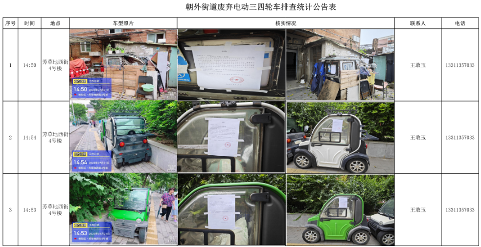 朝外街道废弃电动三四轮车排查统计公告表(芳草地)