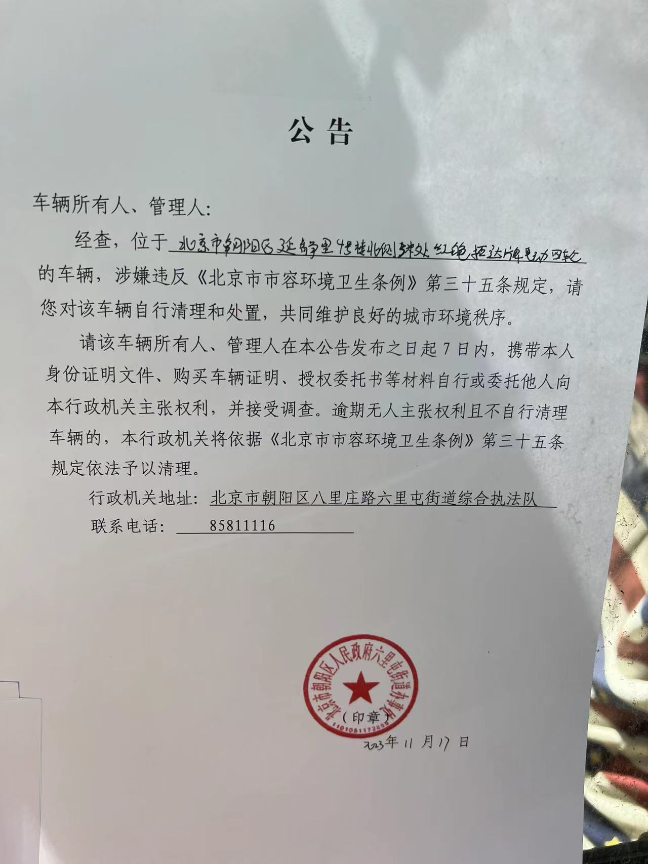 六里屯街道关于清理整治废弃电动三四轮车的公告(延静里4号楼北侧...