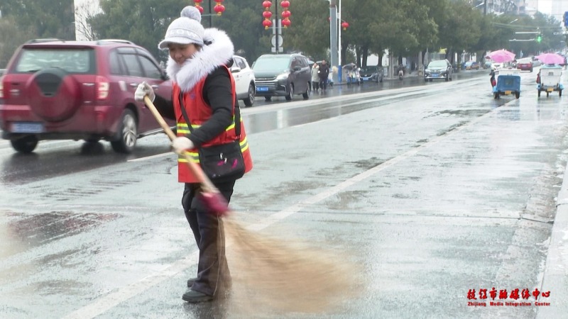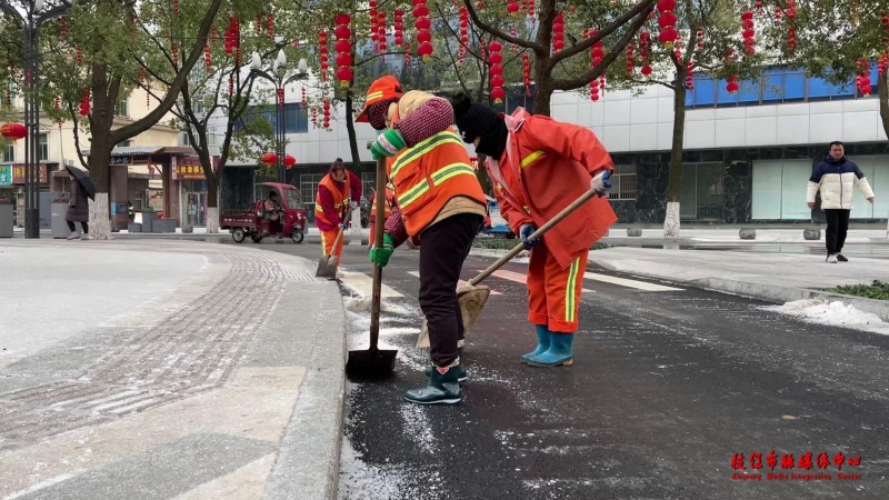 枝江:北风吹雪飞扬 环卫工人除冰忙