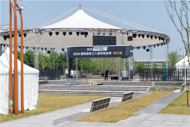 在沿江大道四馆一中心广场,2024国际篮联三人篮球挑战赛枝江站的赛场已搭建成型,工人们正在进行下一阶段的布置工作。余峰来到现场,实地查看场地建设情况,并召开座谈,听取相关负责人关于各项筹备工作的汇报。