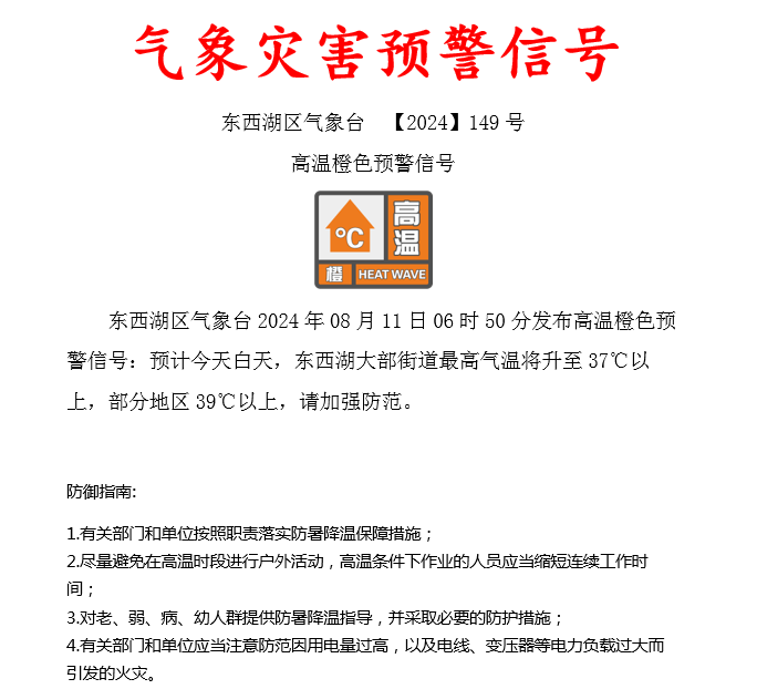 今天(11日)6时50分,东西湖区气象台发布高温橙色预警信号,预计今天白天,武汉最高气温37℃以上,部分地区 39℃以上。