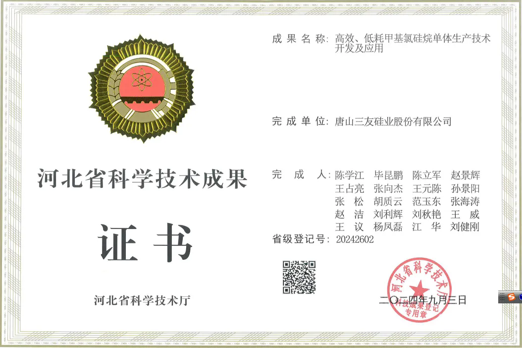 近日,三友集团硅业公司实施的《高效、低耗甲基氯硅烷单体生产技术开发及应用》项目顺利通过了中国科学院唐山高新技术研究与转化中心组织的成果评价鉴定会,专家组成员一致认为该项目创新成果突出,整体达到国内领先水平,并已获河北省科学技术成果登记。