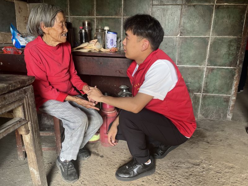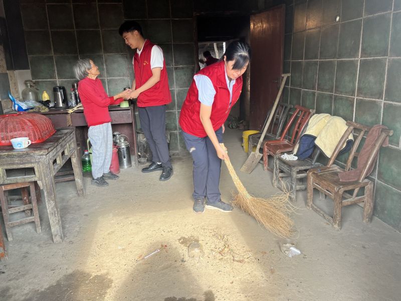 活动中,志愿者们携带清洁工具如抹布、扫帚等,帮助老人打扫房间、整理杂物、擦拭门窗,并仔细检查屋内的电线线路,确保用电安全。在慰问中,志愿者们与村中年迈的陈奶奶进行了长时间的交谈,详细询问了她及其家人的日常生活情况,特别关注其健康状况与生活需求。志愿者们还为老人送上了大米、食用油等日常生活必需品,并表达了节日的问候和祝福。
