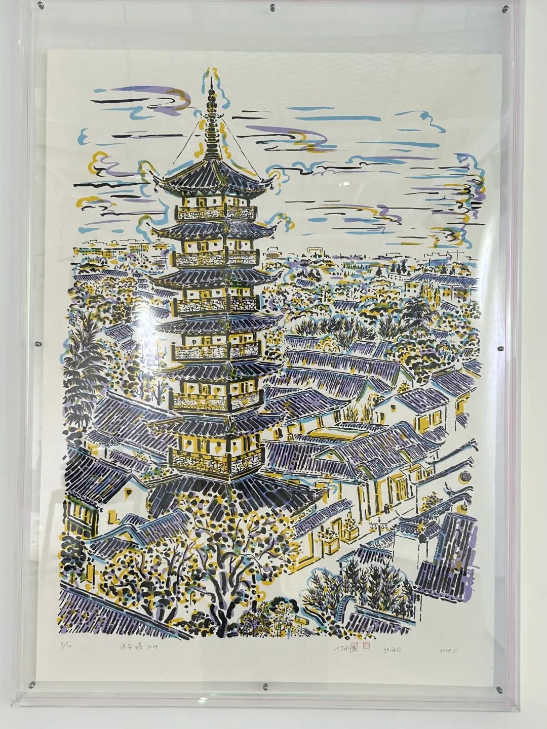 走进艺术馆展厅,一幅由黄色、紫色为主色调的法华塔版画作品,以其明亮的色彩吸引住大部分观众的视线。“这件作品是今年5月以丝网版画的技法来印制的。”青年版画家付永康介绍,“嘉定老城既有古老厚重的文化底蕴,又充满了鲜活的气息,所以我用古代和现代相交融的艺术表现方式来展现。”