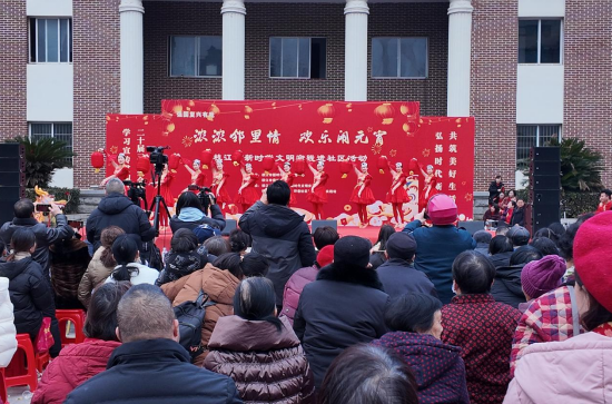 在枝江市大礼堂,荆楚“红色文艺轻骑兵”枝江市歌舞剧团小分队带来“浓浓邻里情 欢乐闹元宵”文艺汇演,歌舞、小品轮番登场,邀请社区居民朋友共庆元宵。