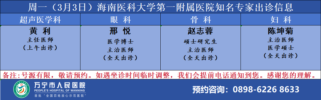 【优质医疗资源下沉】3月3日海南医科大学第一附属医院知名专家到我院坐诊信息